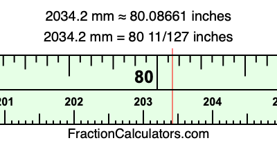 One millimeter is equal to 5/127 inches, and 2034.2 as a fraction is 10171/5. Therefore, to get the fractional answer to 2034.2 mm in inches, we multiply 10171/5 by 5/127 and simplify if necessary.