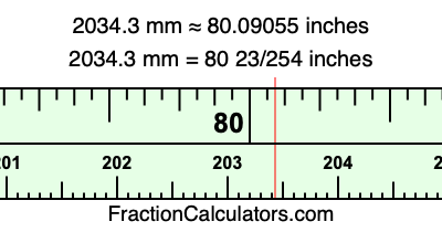One millimeter is equal to 5/127 inches, and 2034.3 as a fraction is 20343/10. Therefore, to get the fractional answer to 2034.3 mm in inches, we multiply 20343/10 by 5/127 and simplify if necessary.