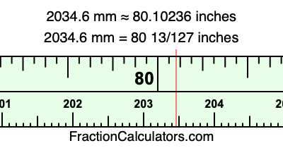 One millimeter is equal to 5/127 inches, and 2034.6 as a fraction is 10173/5. Therefore, to get the fractional answer to 2034.6 mm in inches, we multiply 10173/5 by 5/127 and simplify if necessary.