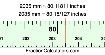 One millimeter is equal to 5/127 inches, and 2035 as a fraction is 2035/1. Therefore, to get the fractional answer to 2035 mm in inches, we multiply 2035/1 by 5/127 and simplify if necessary.