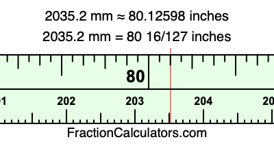 One millimeter is equal to 5/127 inches, and 2035.2 as a fraction is 10176/5. Therefore, to get the fractional answer to 2035.2 mm in inches, we multiply 10176/5 by 5/127 and simplify if necessary.