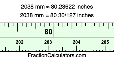 One millimeter is equal to 5/127 inches, and 2038 as a fraction is 2038/1. Therefore, to get the fractional answer to 2038 mm in inches, we multiply 2038/1 by 5/127 and simplify if necessary.