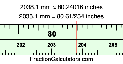 One millimeter is equal to 5/127 inches, and 2038.1 as a fraction is 20381/10. Therefore, to get the fractional answer to 2038.1 mm in inches, we multiply 20381/10 by 5/127 and simplify if necessary.