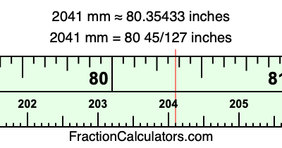 One millimeter is equal to 5/127 inches, and 2041 as a fraction is 2041/1. Therefore, to get the fractional answer to 2041 mm in inches, we multiply 2041/1 by 5/127 and simplify if necessary.
