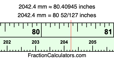 One millimeter is equal to 5/127 inches, and 2042.4 as a fraction is 10212/5. Therefore, to get the fractional answer to 2042.4 mm in inches, we multiply 10212/5 by 5/127 and simplify if necessary.