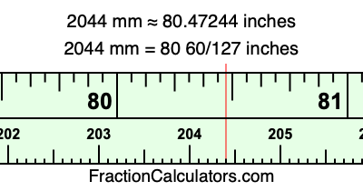 One millimeter is equal to 5/127 inches, and 2044 as a fraction is 2044/1. Therefore, to get the fractional answer to 2044 mm in inches, we multiply 2044/1 by 5/127 and simplify if necessary.