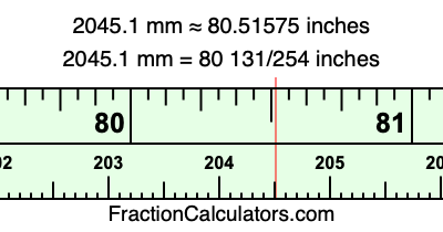 One millimeter is equal to 5/127 inches, and 2045.1 as a fraction is 20451/10. Therefore, to get the fractional answer to 2045.1 mm in inches, we multiply 20451/10 by 5/127 and simplify if necessary.