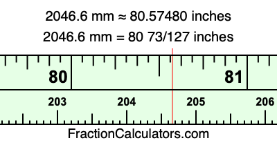 One millimeter is equal to 5/127 inches, and 2046.6 as a fraction is 10233/5. Therefore, to get the fractional answer to 2046.6 mm in inches, we multiply 10233/5 by 5/127 and simplify if necessary.