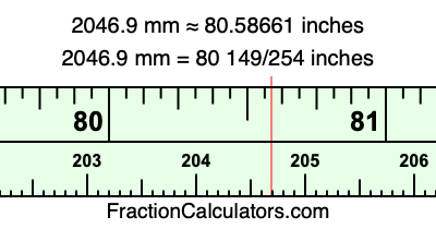 One millimeter is equal to 5/127 inches, and 2046.9 as a fraction is 20469/10. Therefore, to get the fractional answer to 2046.9 mm in inches, we multiply 20469/10 by 5/127 and simplify if necessary.