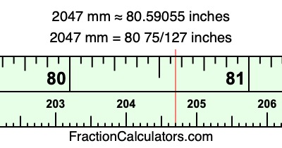 One millimeter is equal to 5/127 inches, and 2047 as a fraction is 2047/1. Therefore, to get the fractional answer to 2047 mm in inches, we multiply 2047/1 by 5/127 and simplify if necessary.