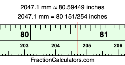 One millimeter is equal to 5/127 inches, and 2047.1 as a fraction is 20471/10. Therefore, to get the fractional answer to 2047.1 mm in inches, we multiply 20471/10 by 5/127 and simplify if necessary.