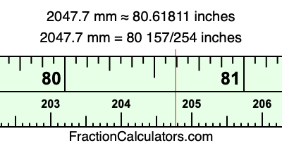 One millimeter is equal to 5/127 inches, and 2047.7 as a fraction is 20477/10. Therefore, to get the fractional answer to 2047.7 mm in inches, we multiply 20477/10 by 5/127 and simplify if necessary.