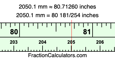 One millimeter is equal to 5/127 inches, and 2050.1 as a fraction is 20501/10. Therefore, to get the fractional answer to 2050.1 mm in inches, we multiply 20501/10 by 5/127 and simplify if necessary.