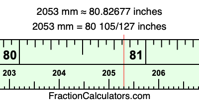 One millimeter is equal to 5/127 inches, and 2053 as a fraction is 2053/1. Therefore, to get the fractional answer to 2053 mm in inches, we multiply 2053/1 by 5/127 and simplify if necessary.