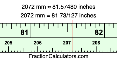 One millimeter is equal to 5/127 inches, and 2072 as a fraction is 2072/1. Therefore, to get the fractional answer to 2072 mm in inches, we multiply 2072/1 by 5/127 and simplify if necessary.