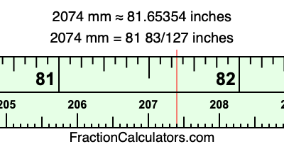 One millimeter is equal to 5/127 inches, and 2074 as a fraction is 2074/1. Therefore, to get the fractional answer to 2074 mm in inches, we multiply 2074/1 by 5/127 and simplify if necessary.
