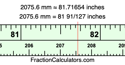 One millimeter is equal to 5/127 inches, and 2075.6 as a fraction is 10378/5. Therefore, to get the fractional answer to 2075.6 mm in inches, we multiply 10378/5 by 5/127 and simplify if necessary.