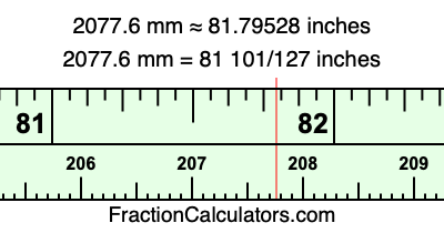 One millimeter is equal to 5/127 inches, and 2077.6 as a fraction is 10388/5. Therefore, to get the fractional answer to 2077.6 mm in inches, we multiply 10388/5 by 5/127 and simplify if necessary.