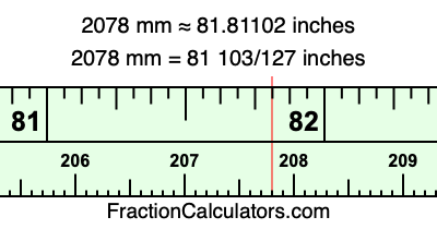 One millimeter is equal to 5/127 inches, and 2078 as a fraction is 2078/1. Therefore, to get the fractional answer to 2078 mm in inches, we multiply 2078/1 by 5/127 and simplify if necessary.
