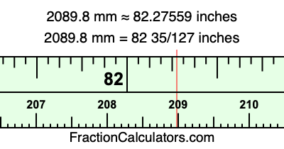 One millimeter is equal to 5/127 inches, and 2089.8 as a fraction is 10449/5. Therefore, to get the fractional answer to 2089.8 mm in inches, we multiply 10449/5 by 5/127 and simplify if necessary.