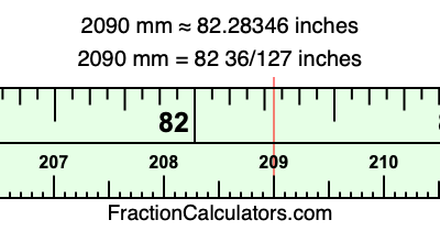 One millimeter is equal to 5/127 inches, and 2090 as a fraction is 2090/1. Therefore, to get the fractional answer to 2090 mm in inches, we multiply 2090/1 by 5/127 and simplify if necessary.