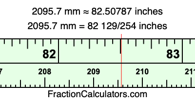 One millimeter is equal to 5/127 inches, and 2095.7 as a fraction is 20957/10. Therefore, to get the fractional answer to 2095.7 mm in inches, we multiply 20957/10 by 5/127 and simplify if necessary.