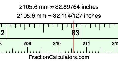 One millimeter is equal to 5/127 inches, and 2105.6 as a fraction is 10528/5. Therefore, to get the fractional answer to 2105.6 mm in inches, we multiply 10528/5 by 5/127 and simplify if necessary.