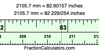 One millimeter is equal to 5/127 inches, and 2105.7 as a fraction is 21057/10. Therefore, to get the fractional answer to 2105.7 mm in inches, we multiply 21057/10 by 5/127 and simplify if necessary.