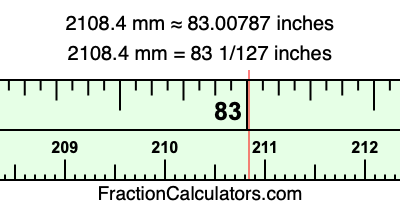 One millimeter is equal to 5/127 inches, and 2108.4 as a fraction is 10542/5. Therefore, to get the fractional answer to 2108.4 mm in inches, we multiply 10542/5 by 5/127 and simplify if necessary.