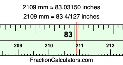 One millimeter is equal to 5/127 inches, and 2109 as a fraction is 2109/1. Therefore, to get the fractional answer to 2109 mm in inches, we multiply 2109/1 by 5/127 and simplify if necessary.