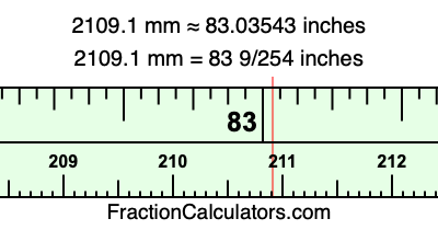 One millimeter is equal to 5/127 inches, and 2109.1 as a fraction is 21091/10. Therefore, to get the fractional answer to 2109.1 mm in inches, we multiply 21091/10 by 5/127 and simplify if necessary.