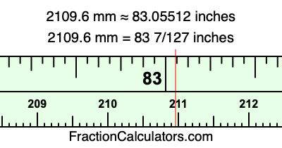 One millimeter is equal to 5/127 inches, and 2109.6 as a fraction is 10548/5. Therefore, to get the fractional answer to 2109.6 mm in inches, we multiply 10548/5 by 5/127 and simplify if necessary.
