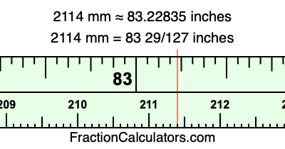 One millimeter is equal to 5/127 inches, and 2114 as a fraction is 2114/1. Therefore, to get the fractional answer to 2114 mm in inches, we multiply 2114/1 by 5/127 and simplify if necessary.