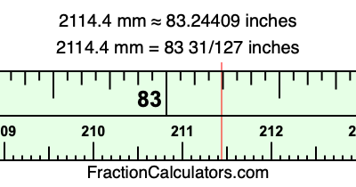 One millimeter is equal to 5/127 inches, and 2114.4 as a fraction is 10572/5. Therefore, to get the fractional answer to 2114.4 mm in inches, we multiply 10572/5 by 5/127 and simplify if necessary.
