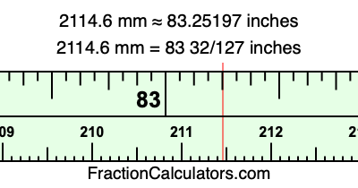 One millimeter is equal to 5/127 inches, and 2114.6 as a fraction is 10573/5. Therefore, to get the fractional answer to 2114.6 mm in inches, we multiply 10573/5 by 5/127 and simplify if necessary.