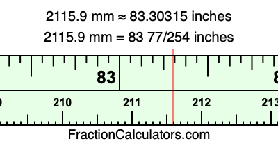 Here is how to convert 2115.9 mm to inches. We will give you the fractional answer, the decimal answer, and illustrate the answer on our tape measure.