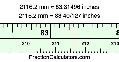 One millimeter is equal to 5/127 inches, and 2116.2 as a fraction is 10581/5. Therefore, to get the fractional answer to 2116.2 mm in inches, we multiply 10581/5 by 5/127 and simplify if necessary.