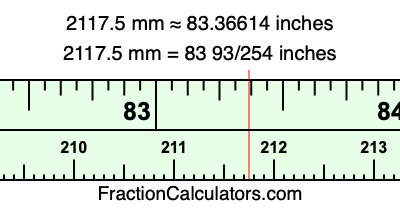 One millimeter is equal to 5/127 inches, and 2117.5 as a fraction is 4235/2. Therefore, to get the fractional answer to 2117.5 mm in inches, we multiply 4235/2 by 5/127 and simplify if necessary.