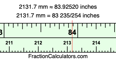One millimeter is equal to 5/127 inches, and 2131.7 as a fraction is 21317/10. Therefore, to get the fractional answer to 2131.7 mm in inches, we multiply 21317/10 by 5/127 and simplify if necessary.