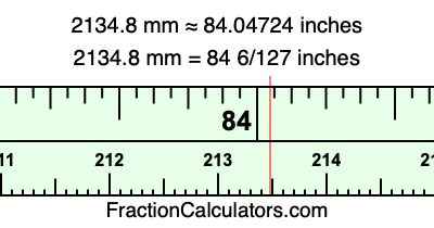 One millimeter is equal to 5/127 inches, and 2134.8 as a fraction is 10674/5. Therefore, to get the fractional answer to 2134.8 mm in inches, we multiply 10674/5 by 5/127 and simplify if necessary.