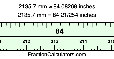 One millimeter is equal to 5/127 inches, and 2135.7 as a fraction is 21357/10. Therefore, to get the fractional answer to 2135.7 mm in inches, we multiply 21357/10 by 5/127 and simplify if necessary.