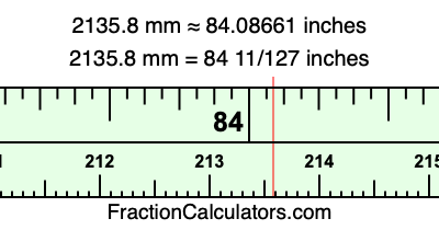 One millimeter is equal to 5/127 inches, and 2135.8 as a fraction is 10679/5. Therefore, to get the fractional answer to 2135.8 mm in inches, we multiply 10679/5 by 5/127 and simplify if necessary.