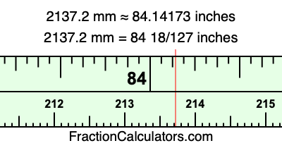 One millimeter is equal to 5/127 inches, and 2137.2 as a fraction is 10686/5. Therefore, to get the fractional answer to 2137.2 mm in inches, we multiply 10686/5 by 5/127 and simplify if necessary.