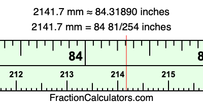 One millimeter is equal to 5/127 inches, and 2141.7 as a fraction is 21417/10. Therefore, to get the fractional answer to 2141.7 mm in inches, we multiply 21417/10 by 5/127 and simplify if necessary.
