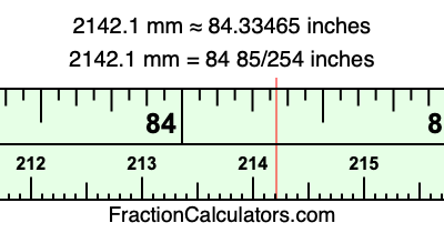 One millimeter is equal to 5/127 inches, and 2142.1 as a fraction is 21421/10. Therefore, to get the fractional answer to 2142.1 mm in inches, we multiply 21421/10 by 5/127 and simplify if necessary.