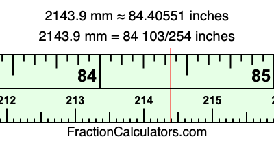 One millimeter is equal to 5/127 inches, and 2143.9 as a fraction is 21439/10. Therefore, to get the fractional answer to 2143.9 mm in inches, we multiply 21439/10 by 5/127 and simplify if necessary.