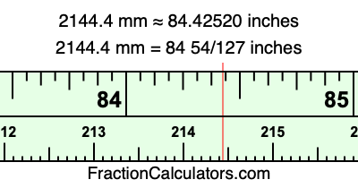 One millimeter is equal to 5/127 inches, and 2144.4 as a fraction is 10722/5. Therefore, to get the fractional answer to 2144.4 mm in inches, we multiply 10722/5 by 5/127 and simplify if necessary.