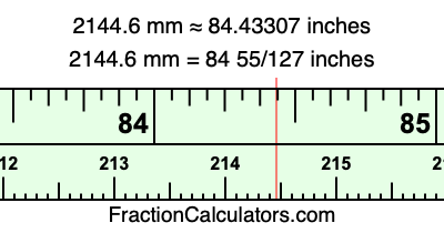 One millimeter is equal to 5/127 inches, and 2144.6 as a fraction is 10723/5. Therefore, to get the fractional answer to 2144.6 mm in inches, we multiply 10723/5 by 5/127 and simplify if necessary.