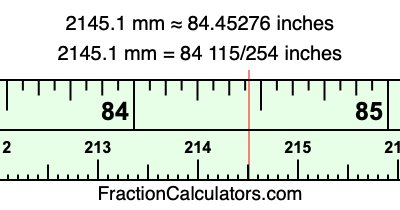 One millimeter is equal to 5/127 inches, and 2145.1 as a fraction is 21451/10. Therefore, to get the fractional answer to 2145.1 mm in inches, we multiply 21451/10 by 5/127 and simplify if necessary.