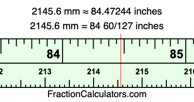One millimeter is equal to 5/127 inches, and 2145.6 as a fraction is 10728/5. Therefore, to get the fractional answer to 2145.6 mm in inches, we multiply 10728/5 by 5/127 and simplify if necessary.